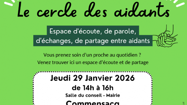 De 14h à 16h à la salle du conseil de la mairie de Commensacq, sur le sujet: "Si je devais garder une leçon de 2025 de mon rôle d'aidant(e), ce serait
