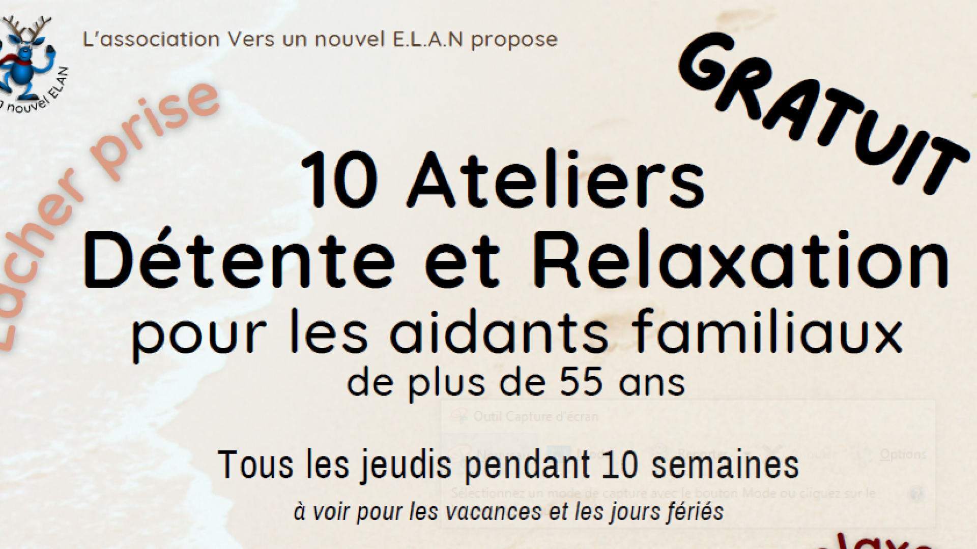 Ouvert gratuitement pour tous les aidants de plus de 55 ans. de 16h30 à 17h30 à l'auditorium du village landaise Alzheimer Henri Emmanuelli. Groupe de 10-12 personnes d'aidants familiaux.