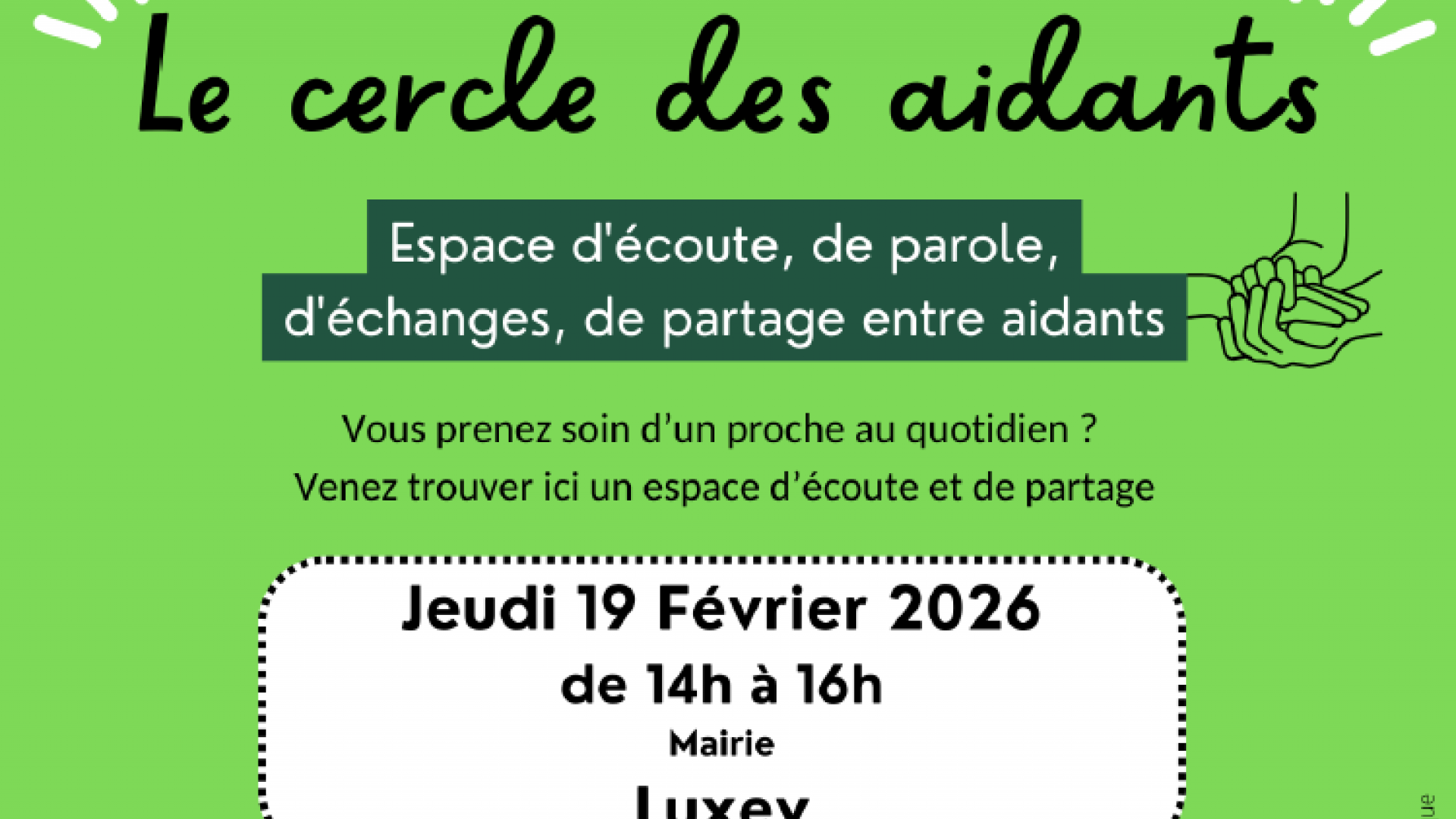 Cercle des Aidants le 19 février à Luxey ! Publié le 20 août 2025 / Dernière modification le 02 février 2026 Cercle des Aidants le 19 février à Luxey ! Publié le 20/08/2025 - Dernière modification le 02/02/2026 De 14h à 16h à la mairie de Luxey, sur le sujet: "J'essaie de faire au mieux, pourquoi j'ai le sentiment d'être le/ méchant(e) ?" Pour vous inscrire, contactez par mail l.bentes@ciascoeurhautelande.fr ou par téléphone le 06 80 77 16 67