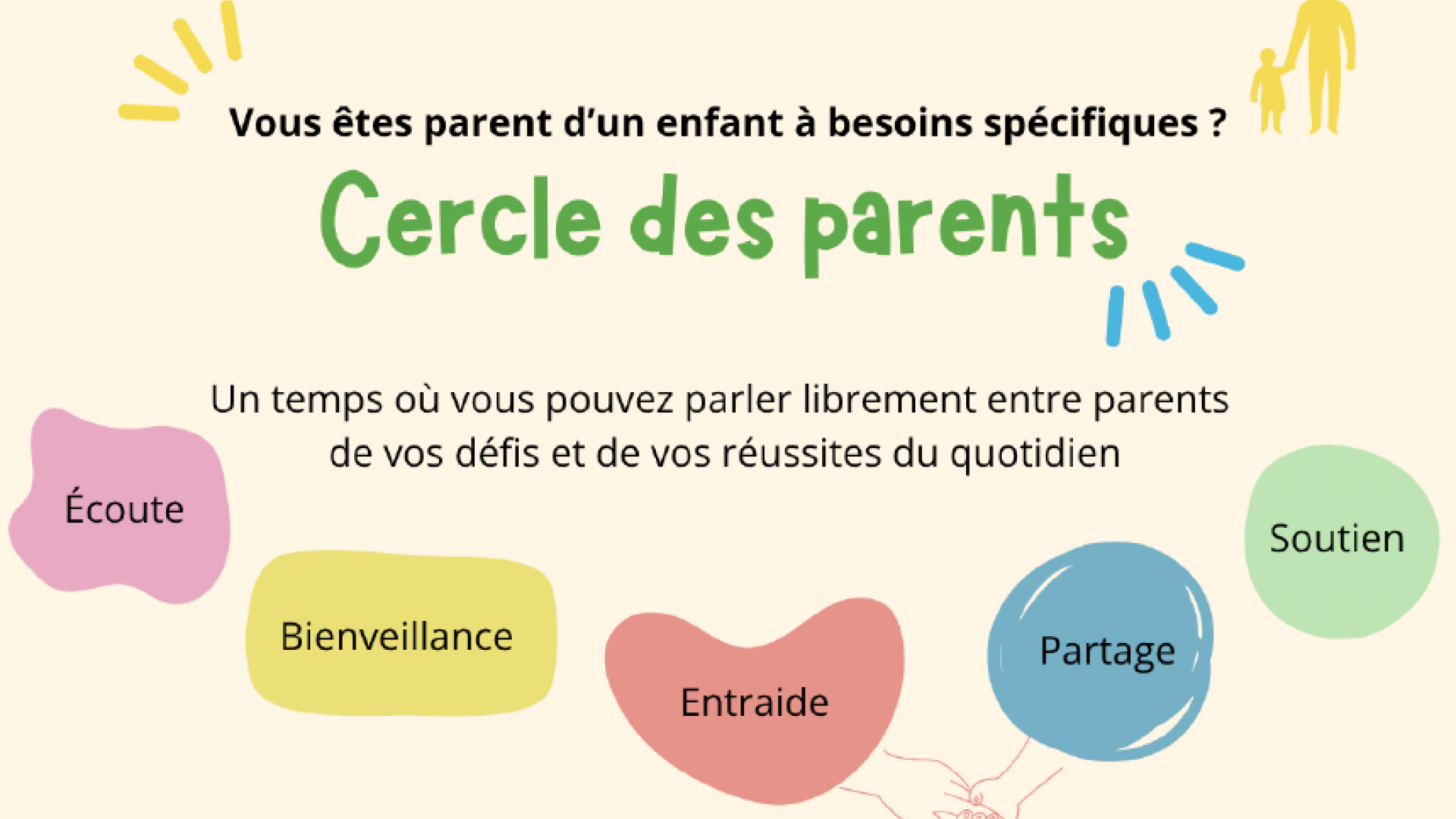 Un temps ou vous pouvez parler librement entre parents de vos défis et de vos réussites du quotidien.